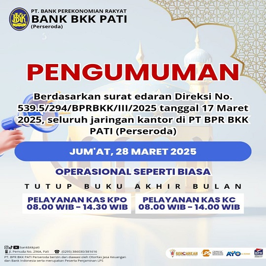 Kami ingin menginformasikan bahwa PT. BPR BKK PATI (Perseroda) akan membuka layanan pada: