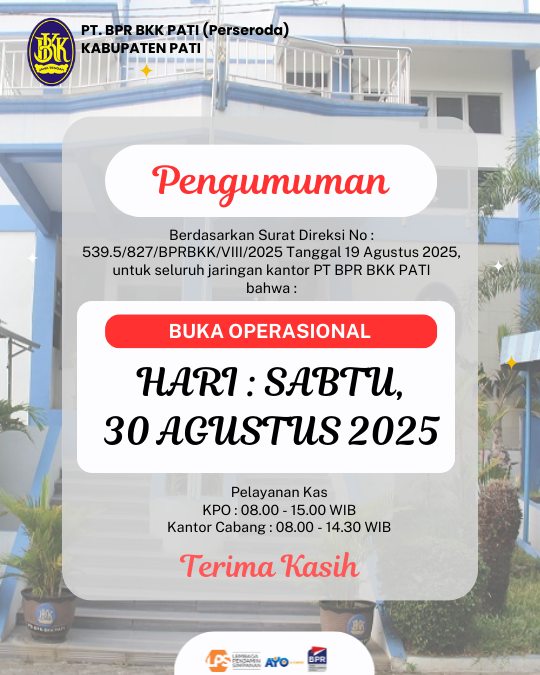 Dalam rangka memberikan pelayanan terbaik kepada masyarakat dan mendukung kelancaran operasional perbankan, dengan ini kami sampaikan bahwa seluruh jaringan kantor PT. BPR BKK PATI (Perseroda) akan tetap BUKA OPERASIONAL pada tanggal 30 Agustus 2025.