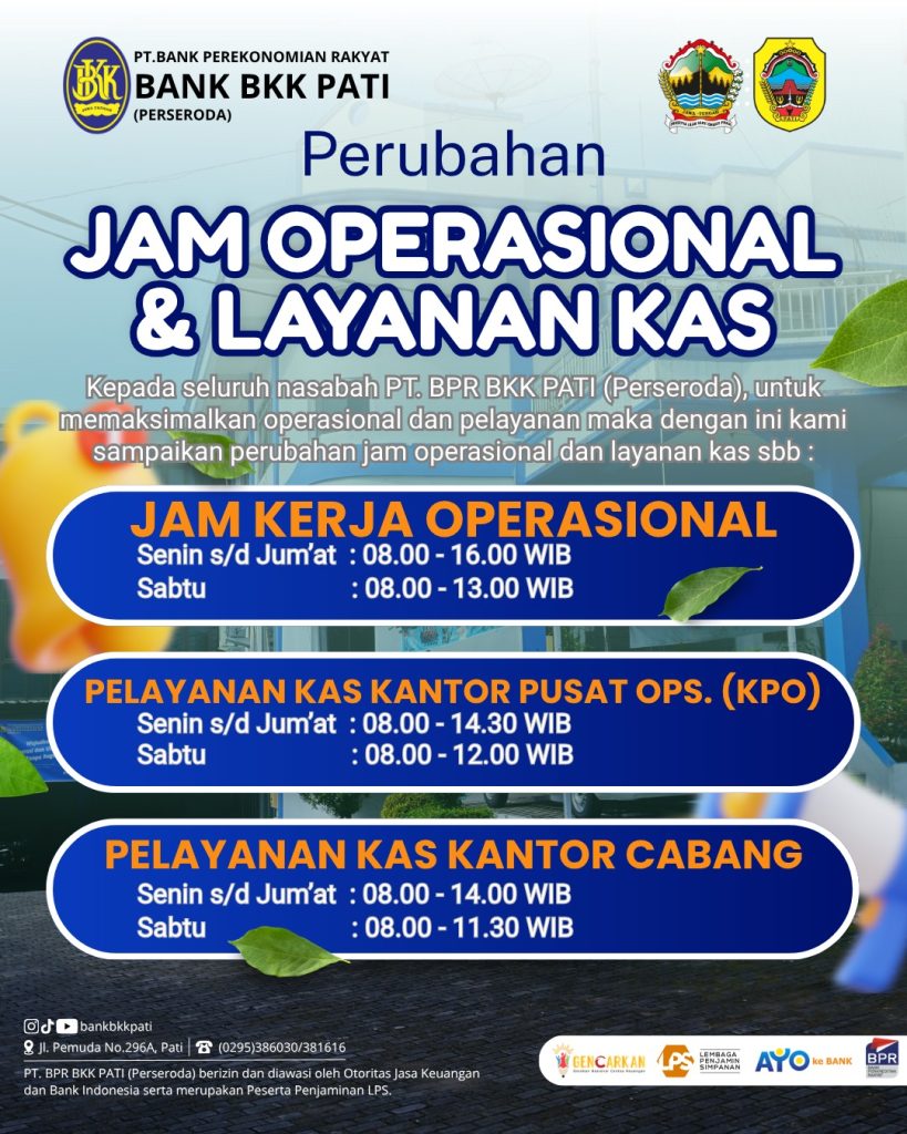 Dalam rangka meningkatkan efektivitas kegiatan operasional serta memastikan pelayanan kepada nasabah berjalan lebih optimal, PT. BPR BKK Pati (Perseroda) menetapkan penyesuaian jam operasional kantor dan layanan kas. Kebijakan ini dilakukan sebagai bentuk komitmen perusahaan dalam memberikan layanan yang lebih teratur, efisien, dan sesuai dengan kebutuhan transaksi nasabah.